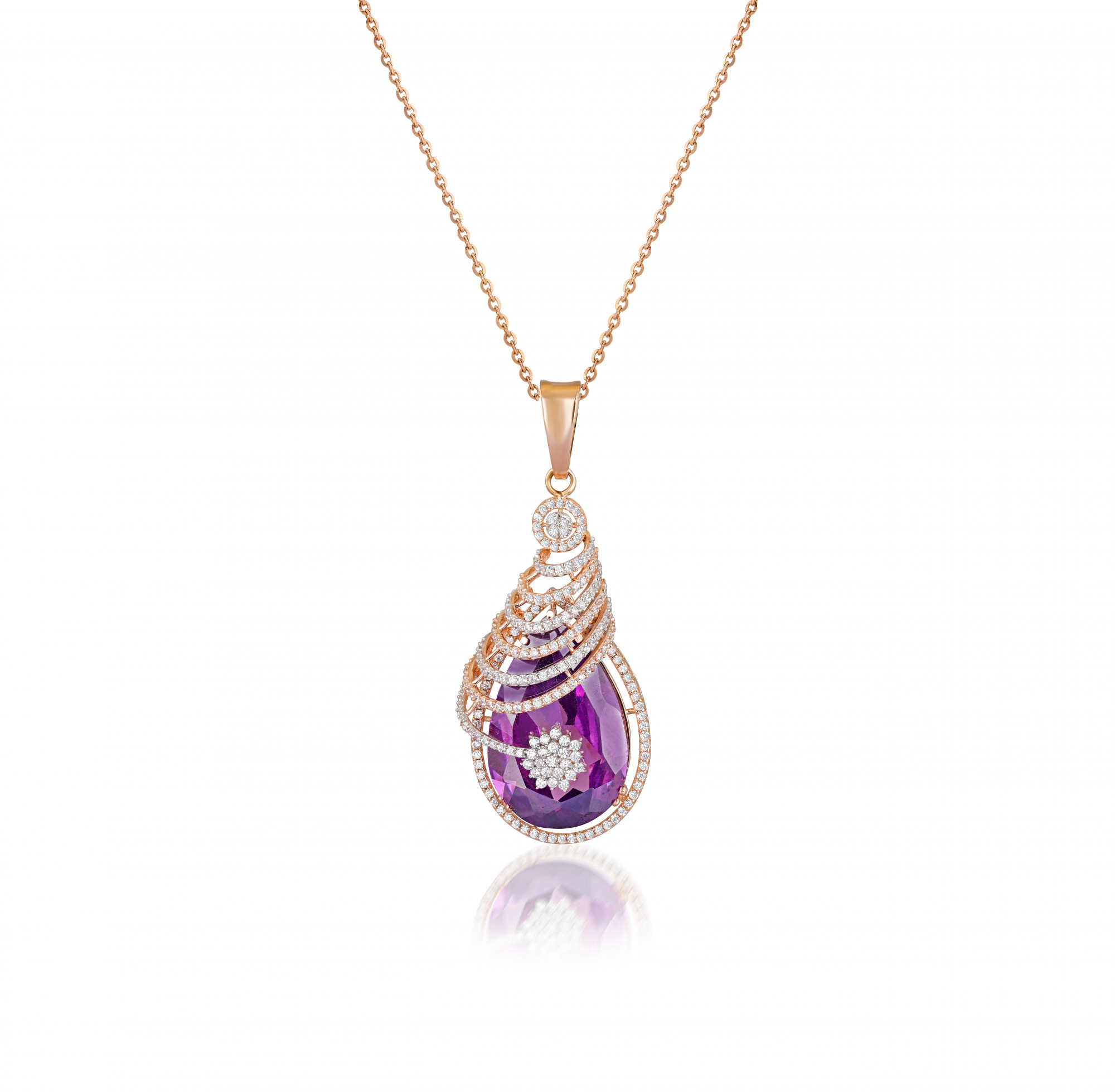Teardrop amethyst surrounded by a Cz diamond halo and sweeping rose-gold accents. Delicate chain completes the elegant, statement-making pendant, perfect for special occasions and daily luxe.