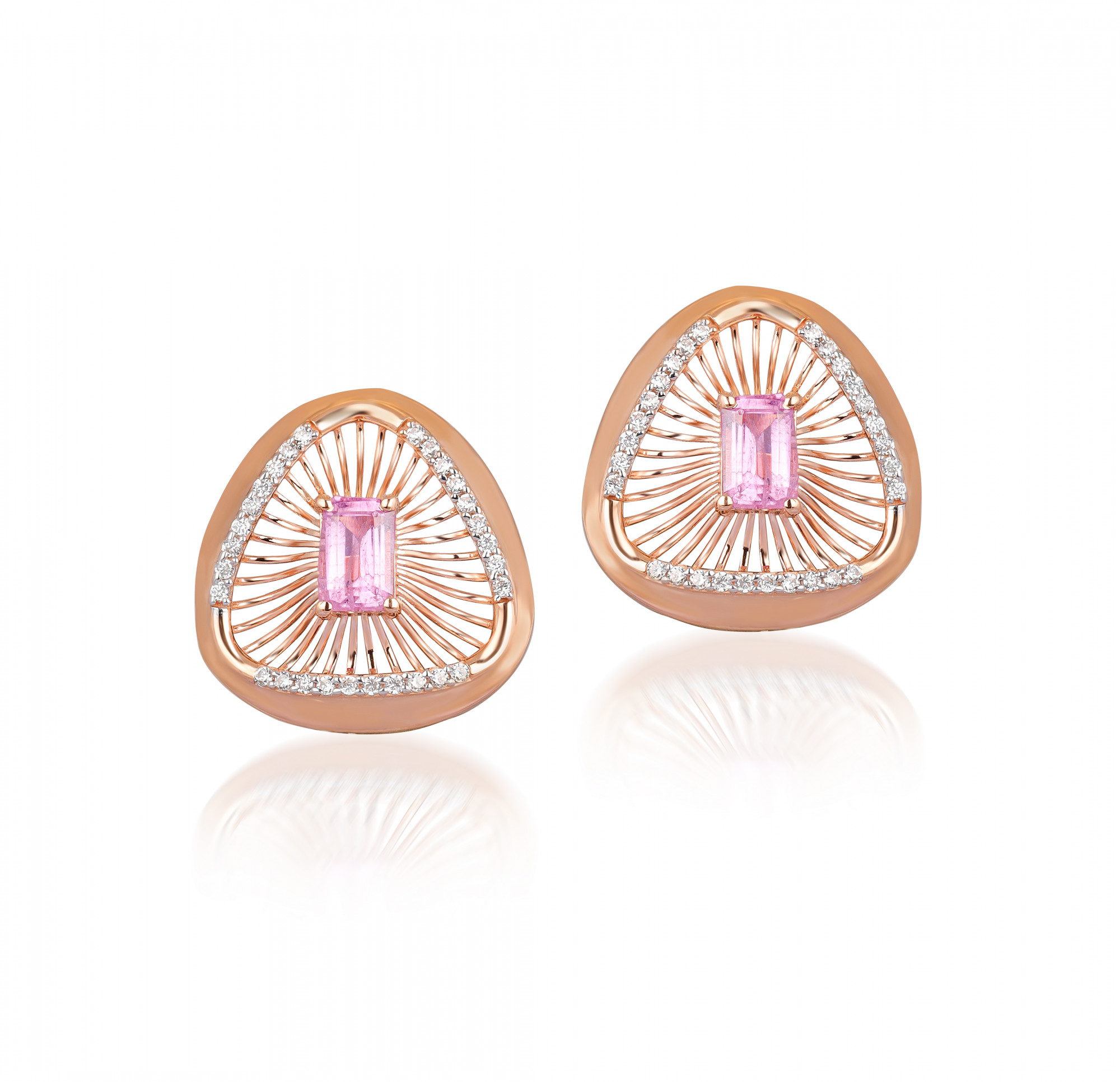 Elegant gold earrings featuring a pink rectangular center gemstone framed by a sparkling, fan-like design with micro pavé accents. Perfect for statement style.