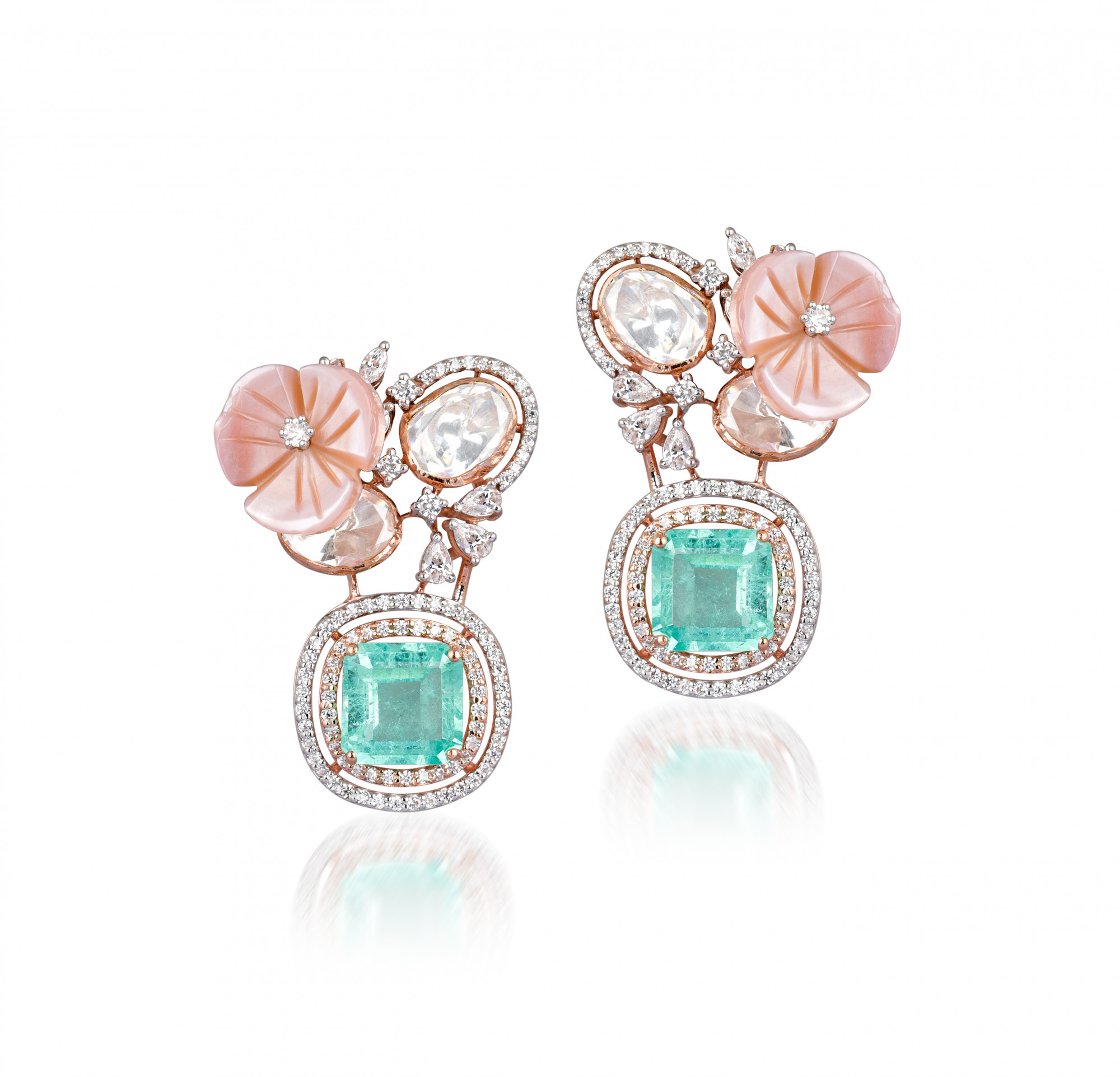 Polki diamond earrings with a green emerald center, surrounded by diamonds. Rose Gold adds luxury for special occasions.